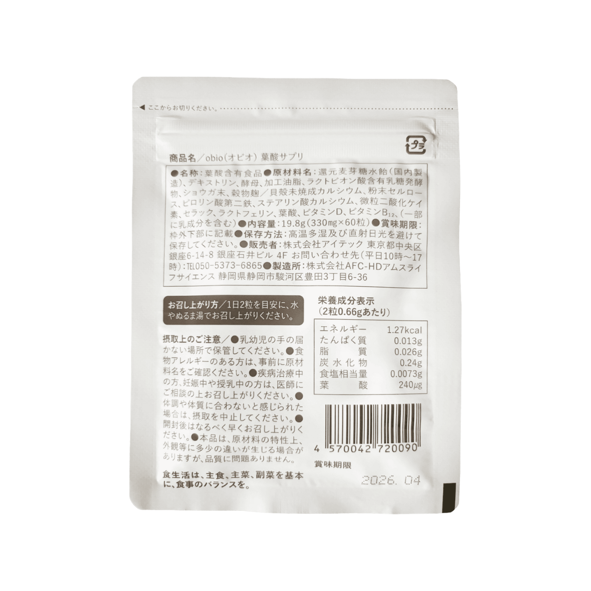 - 3 × Obio – Folate Supplement for Pregnancy & Breastfeeding (90 days) – A Japan-made supplement crafted with folate as its key ingredient, produced under GMP-certified standards for reliable daily use during pregnancy and breastfeeding.